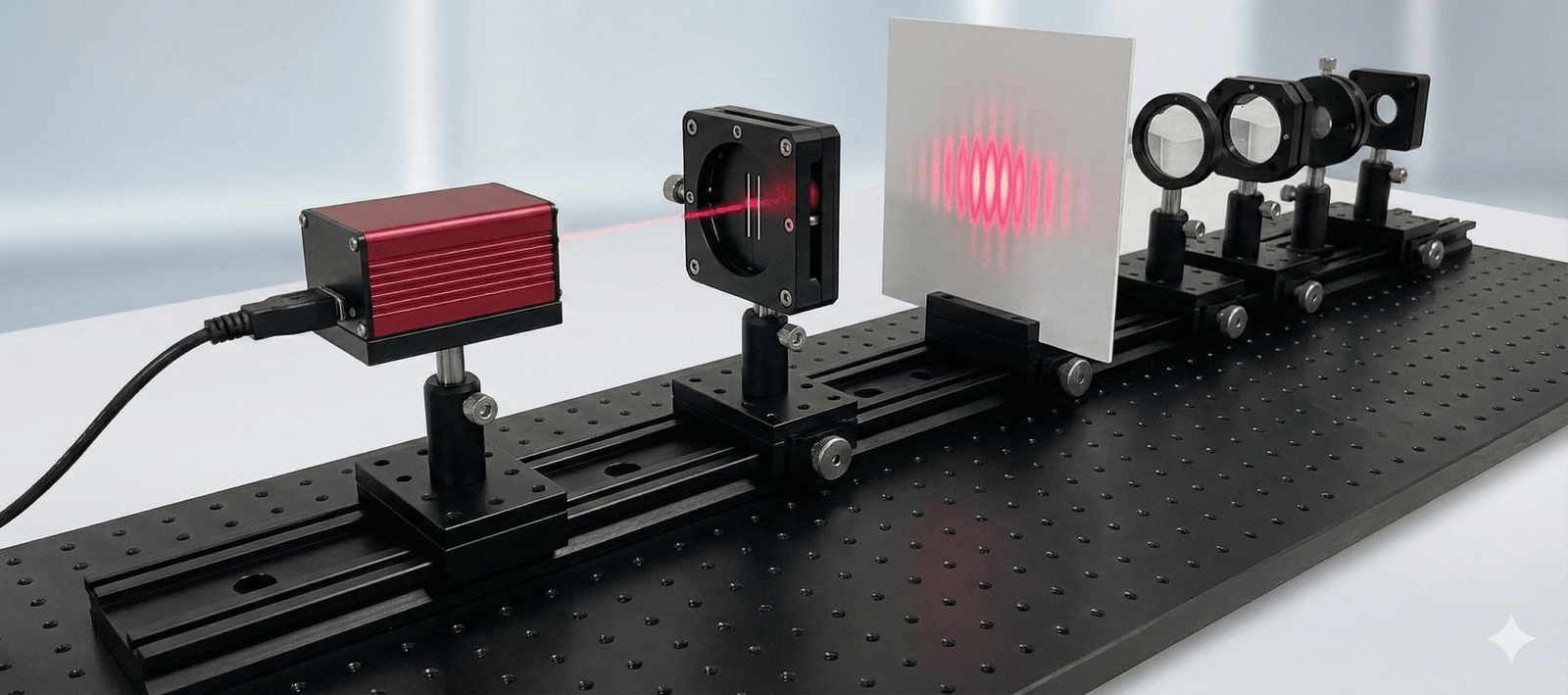 Optik Raylar ve Taşıyıcılar kullanarak ve yarık levhaları, filtre tutucular ve direk tutucular gibi bileşenleri entegre ederek, optik ve kuantum mekaniği alanlarındaki temel ilkeleri keşfetmek için kolayca bir çift yarık deneyi kurabilirsiniz. Bu deney, ışık, dalgalar ve parçacıklar hakkında anlayış geliştirmek için temel bir yapı taşıdır ve optiğin hem akademik hem de pratik uygulamalarında önemli bir egzersizdir.